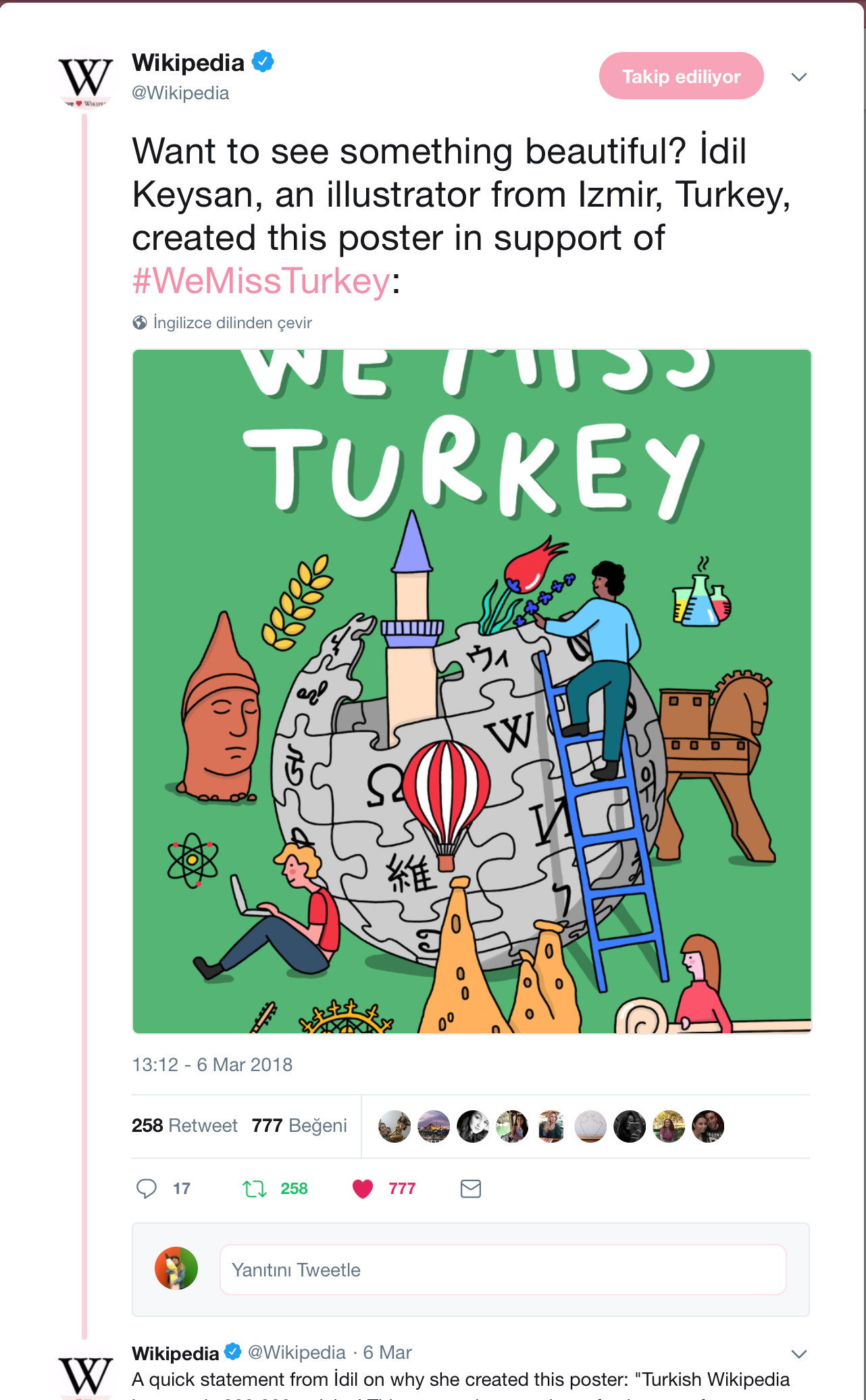 Turkish Wikipedia has nearly 300.000 articles that written by volunteers from across Turkey. I inspired by the idea of these volunteer people who contribute the knowledge in our language to help us learn and the variety of Turkish culture and heritage that they can inform the world. Wikipedia wants to say #WeMissTurkey to the whole world with this beautiful campaign.
